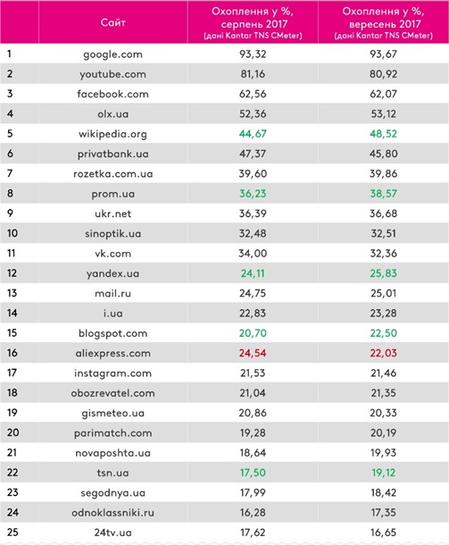 За соцсетью Facebook закрепилась третья позиция рейтинга. На четвертом месте находится доска объявлений Olx. Также, увеличение охвата наблюдается в Wikipedia, которая благодаря этому переместилась с 6 позиции и в сентябре замыкает Топ-5.